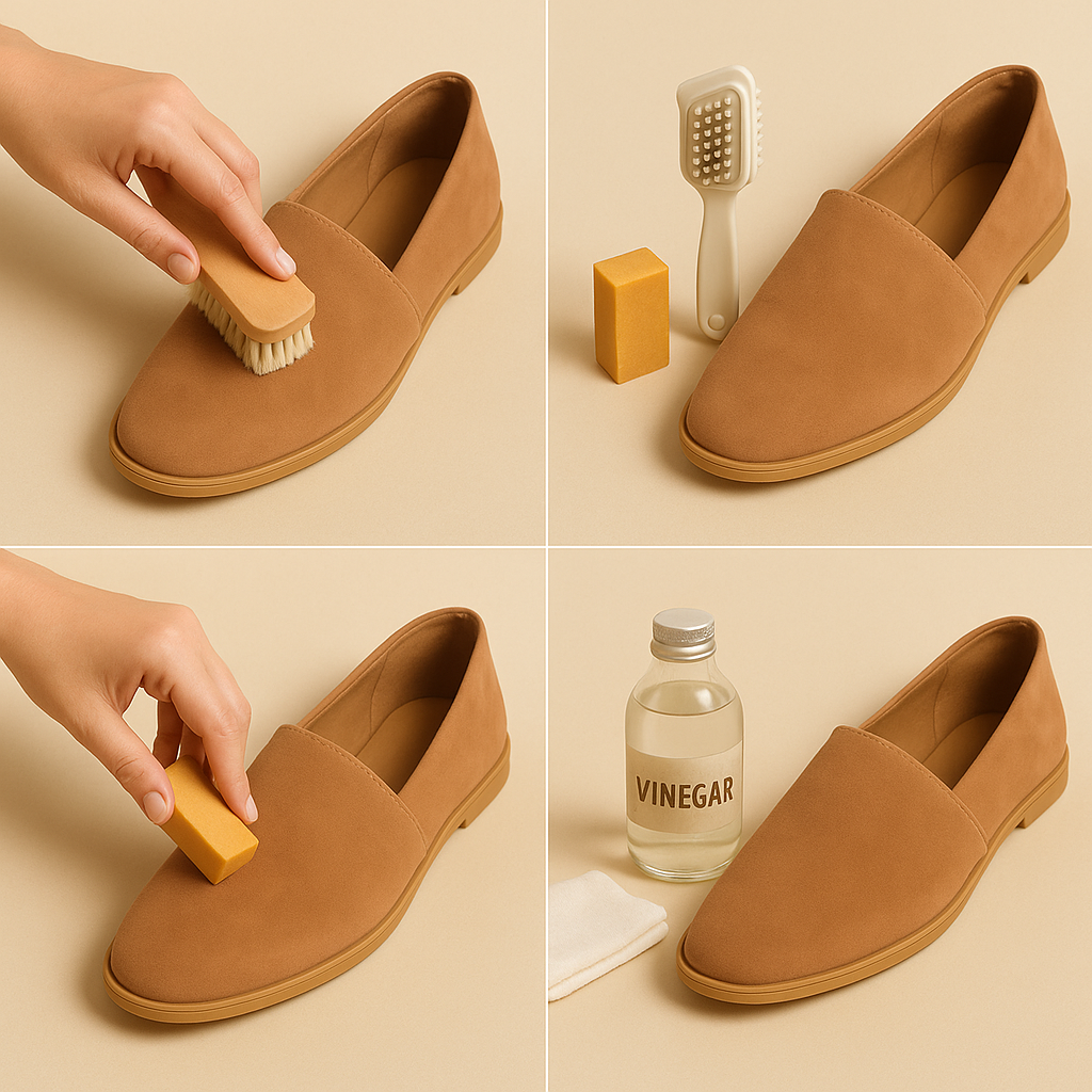 - For stains, gently rub with a suede eraser or a dab of white vinegar on a cloth.