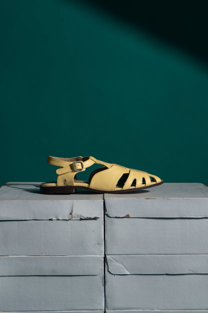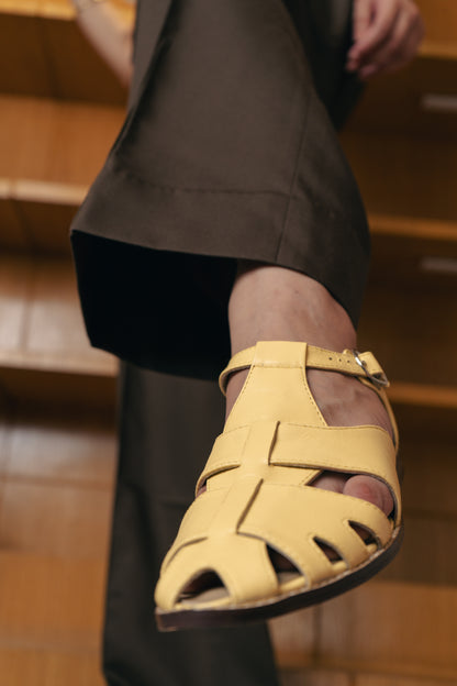 Not your usual neutral. This pastel yellow fisherman sandal is crafted in genuine leather with a 0.5-inch wooden heel, perfect for those who like their classics with a bold twist.